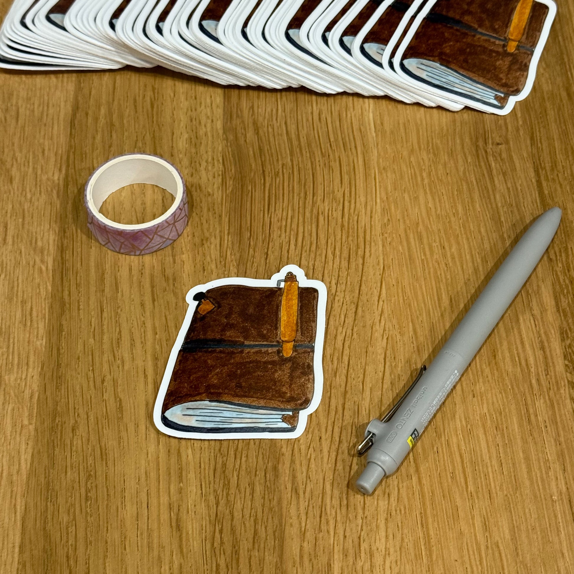This hand-illustrated vinyl sticker captures a classic leather notebook -soft edges, full pages, and a brass pen clipped in place, ready for whatever you’re writing next.